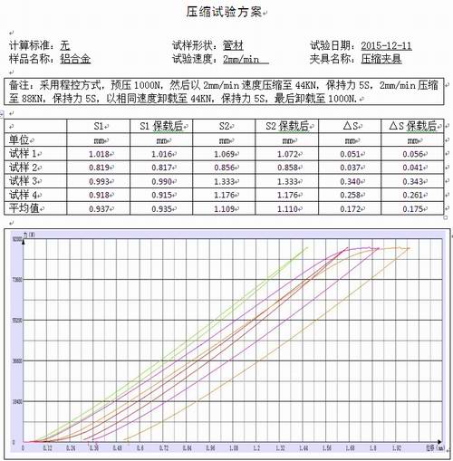 该客户是一家专业从汽车零配件加工高科技企业!如今随着社会的进步与发展,人们对生活质量的要求也在不断提高,汽车已经在人们生活中占着重要地位,成为了人们出门不可或缺的交通工具了,而汽车零部件,是构成汽车配件加工整体的各单元及服务于汽车配件加工的产品!伴随着工业经济的飞速发展,目前铝合金已经被广泛的应用于汽车零部件的生产及加工中,铝合金是工业中应用最广泛的一类有色金属结构材料,在航空、航天、汽车、机械制造、船舶及化学工业中已大量应用。此次该客户委托我司做了铝合金的压缩试验方案,如下试验的数据及参数就是用我们三思泰捷的试验机得出的结果: