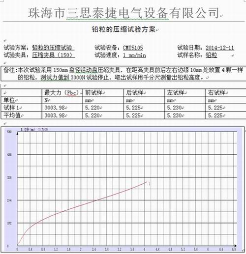 该客户是一家专业生产汽车缸体密封垫等密封产品的企业。铅粒是一种化学物质,质重而软,延展性好;易熔融、铸造、滚压和挤压,能与许多金属共熔为合金,立方晶体结构。主要用途是用于测定锡的还原剂;使高铁还原成亚铁;用于铱与铂和铷的分离,合金制造等!此次该客户委托我司做的是铅粒的压缩试验方案,如下的相关试验数据及参数是用我们三思泰捷的试验机设备试验得出的结果: